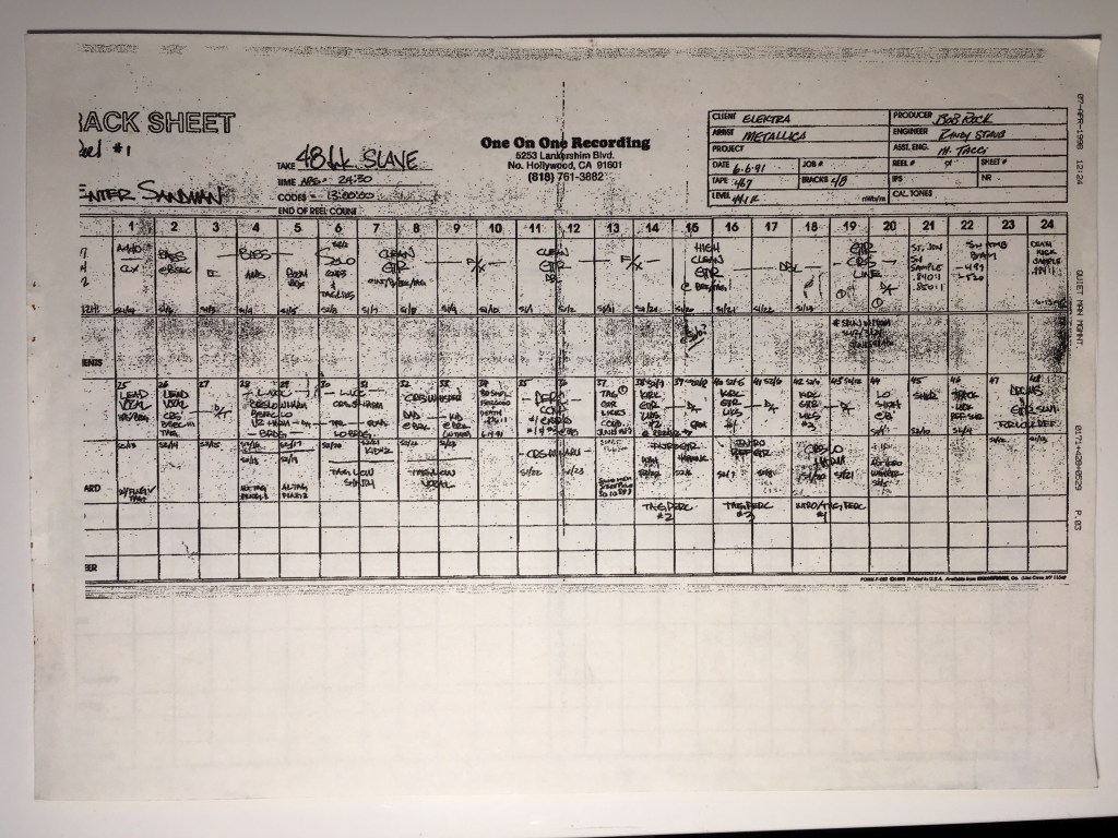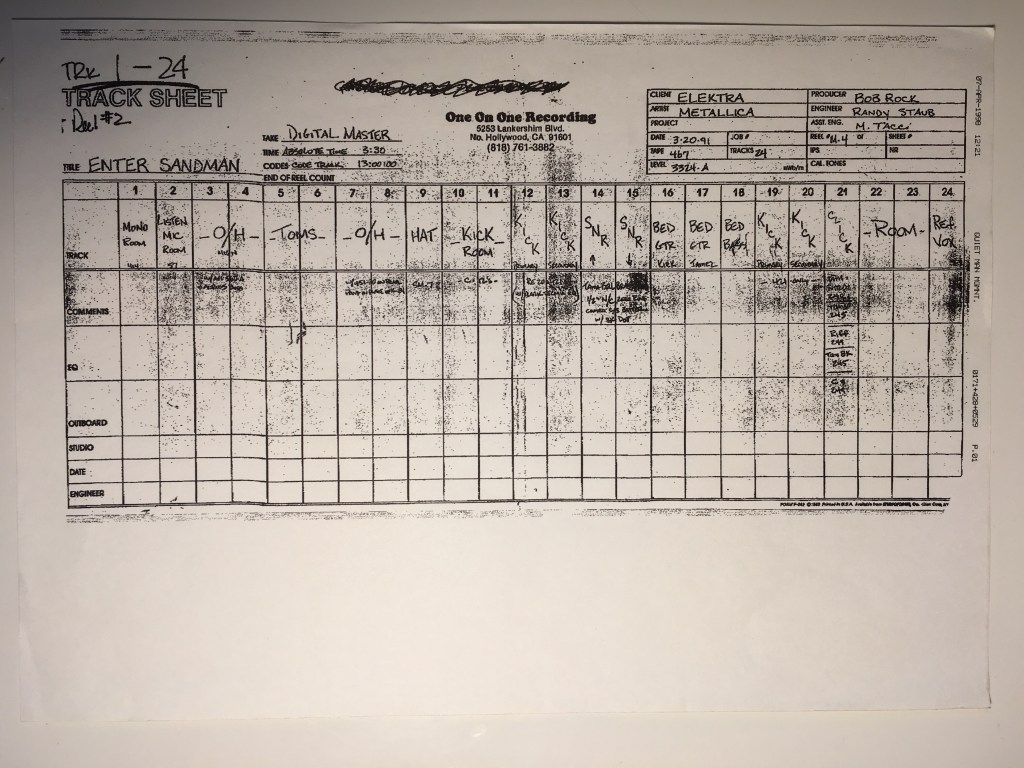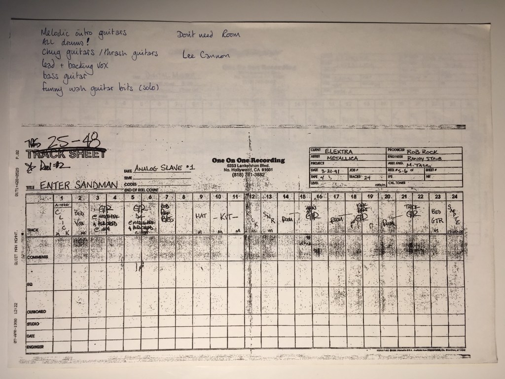 A while back I was asked to remix Metallica’s classic Enter Sandman and, whilst the remix never got used, I thought the tracking sheet might be of interest to some. It’s from a fax so the quality is pretty poor.
